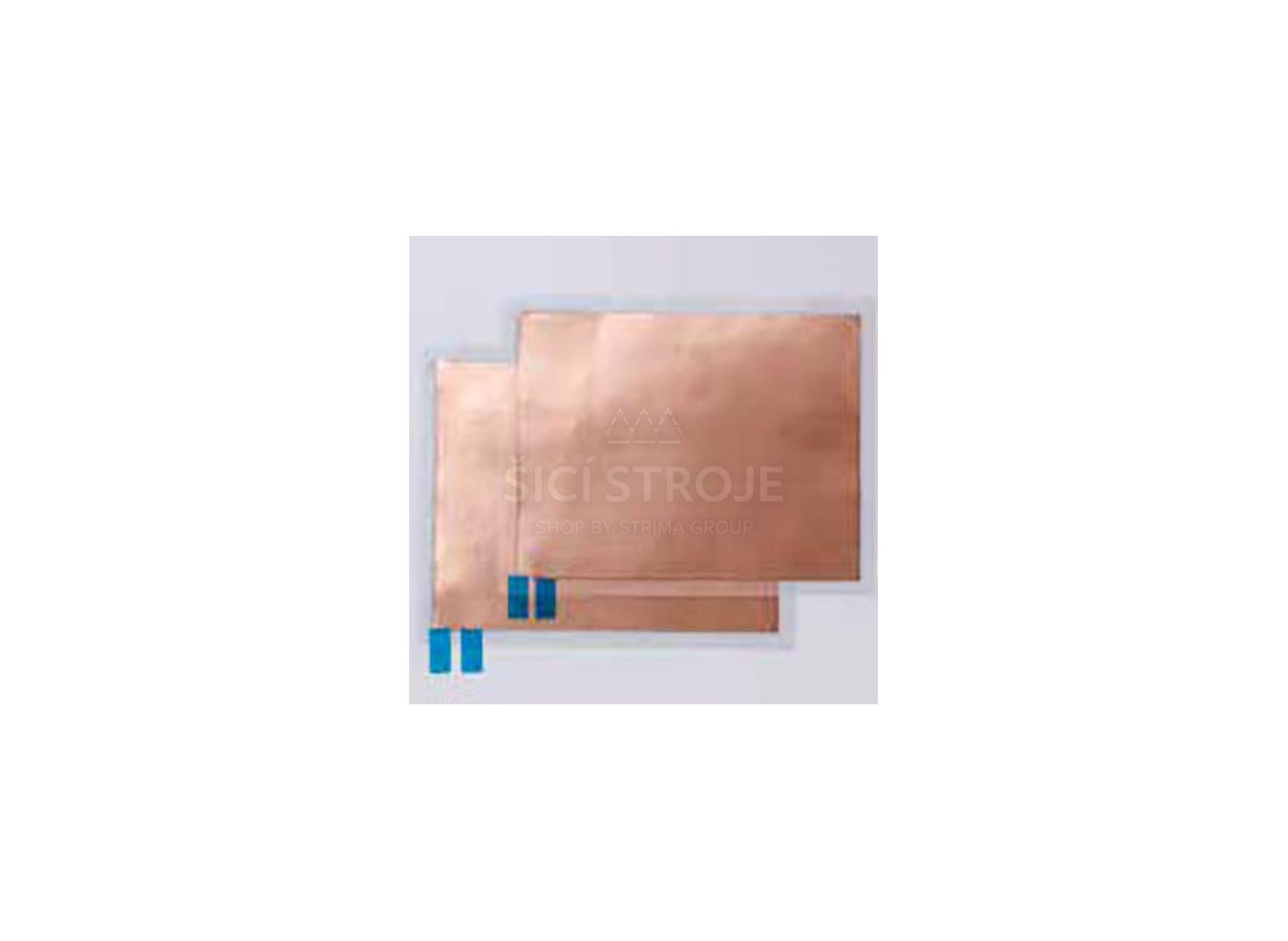 Kovový list v bronzové barvě opatřený oboustranně krycí fólií pro embosování.