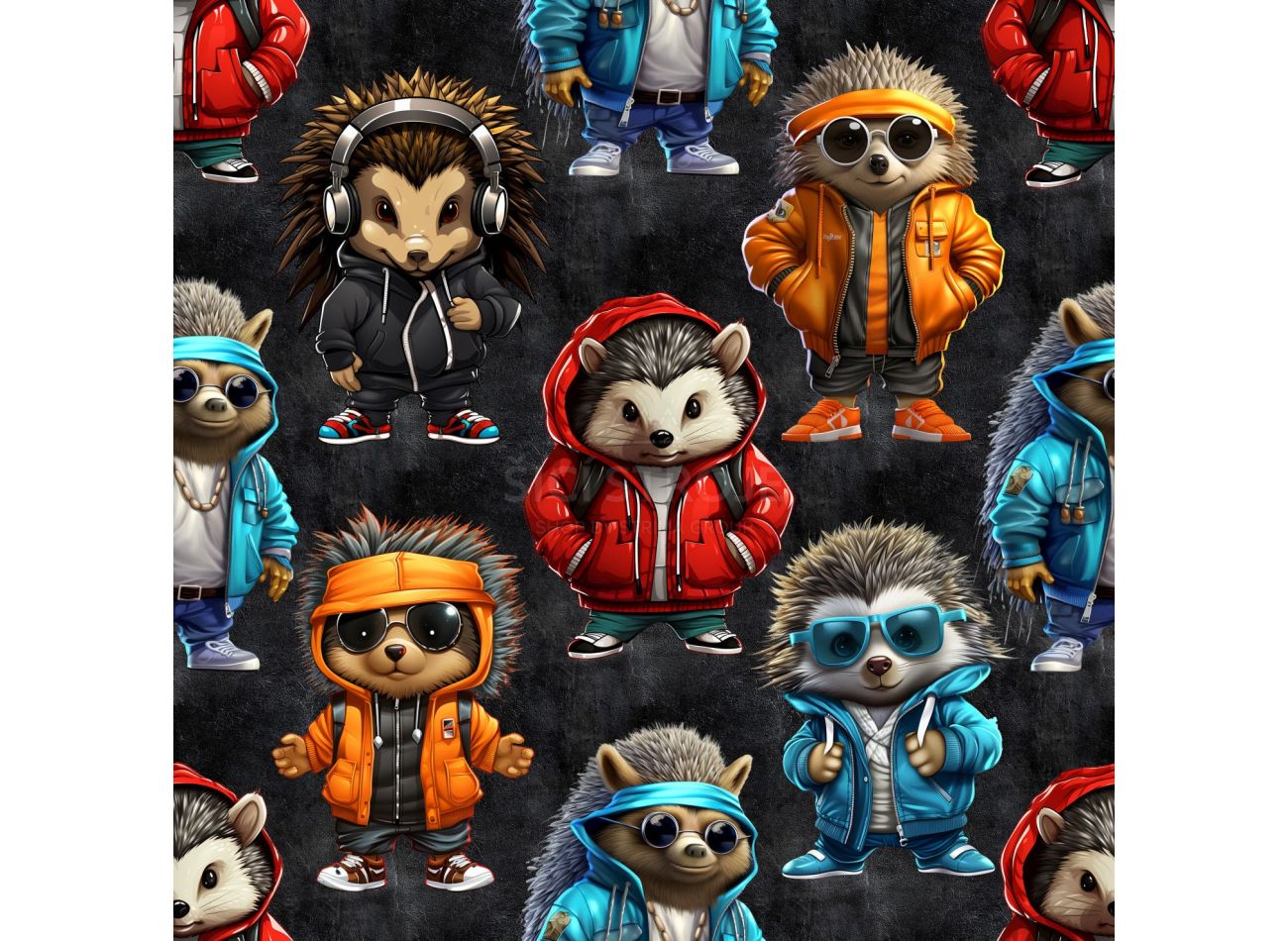 French Terry Digital Print, 95% bavlna, 5% elastan, minimální šíře 145 cm, gramáž 230 g/m2, vzor cool hedgehogs, barva black..