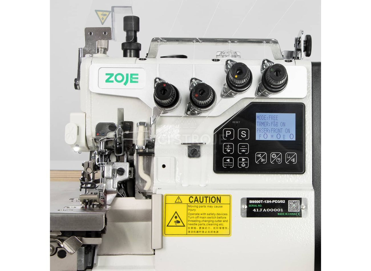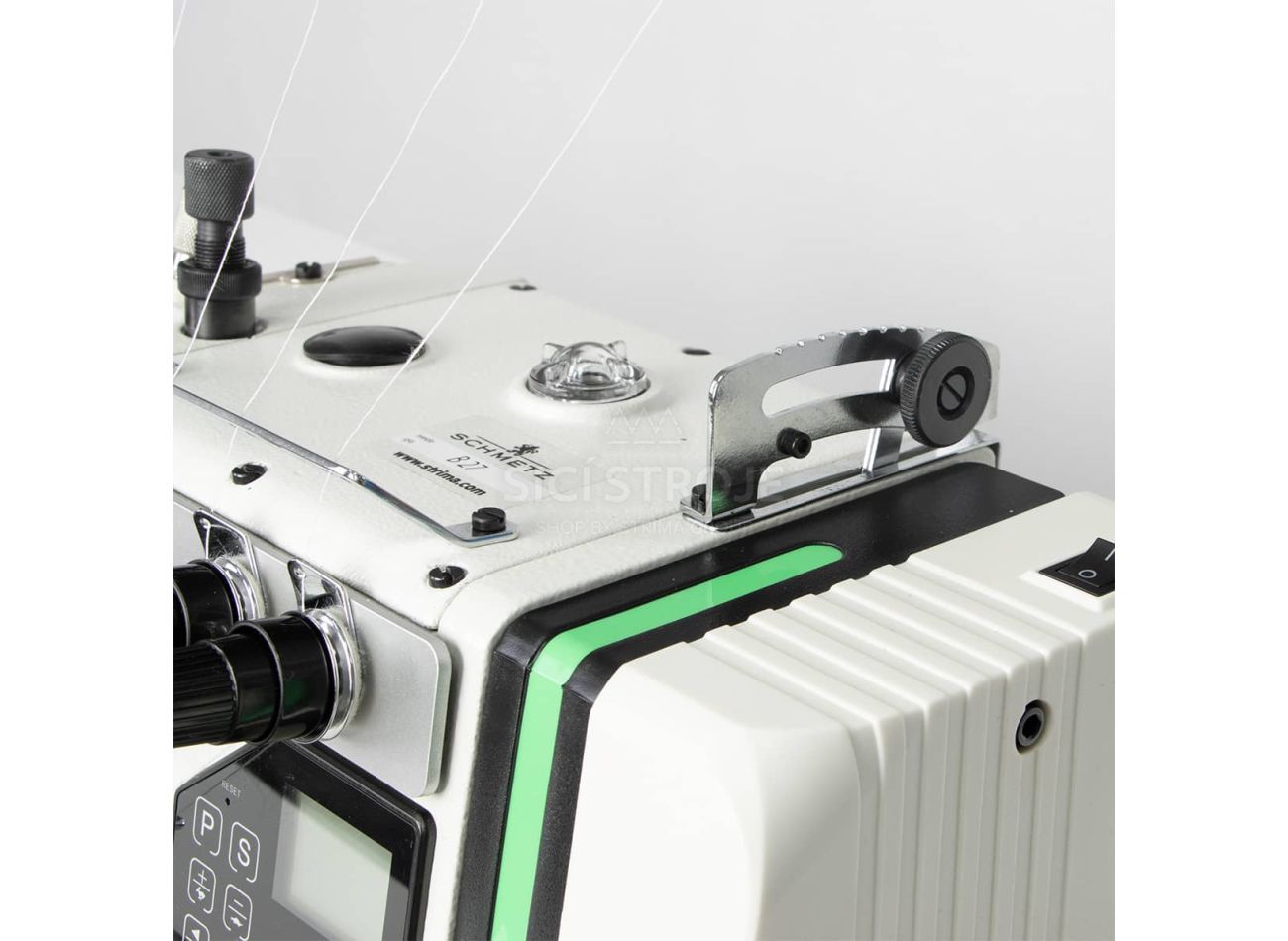 Stroj je vybaven automatickými funkcemi: polohování jehly nahoru/dolů, pneumatické zvedání přítlačné patky a pneumatický odstřih nitě (řetízkový steh). Tlačítko pro rychlý řetízkový steh umožňuje i ruční ovládání odstřihu nitě. Stroj má senzory přítomnosti látky před a za přítlačnou patkou a také bezpečnostní senzor vedle nože. Stroj je vybaven praktickým systémem odsávání odpadu. Pracovní prostor je osvětlen LED světlem. Energeticky úsporný servomotor AC o výkonu 550 W zabudovaný v hlavě zajišťuje tichý provoz bez nežádoucích vibrací.