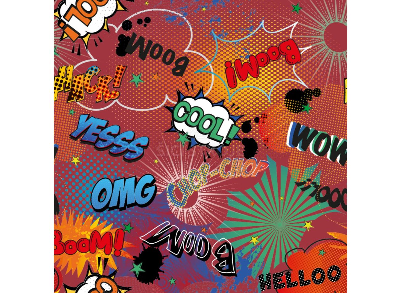 Soft Shell Digital Print, 97% polyester, 3% elastan, minimální šíře 145 cm, gramáž 310 g/m2, vzor comic, barva dark red