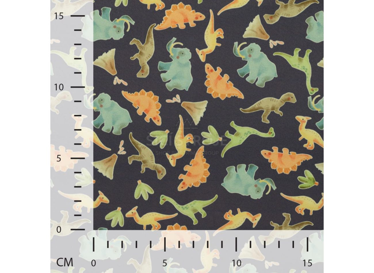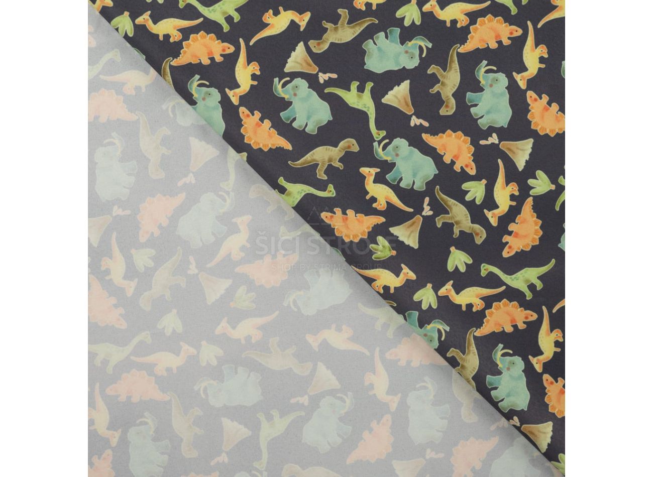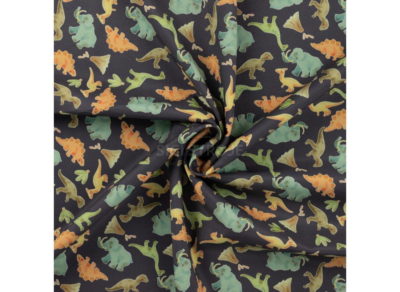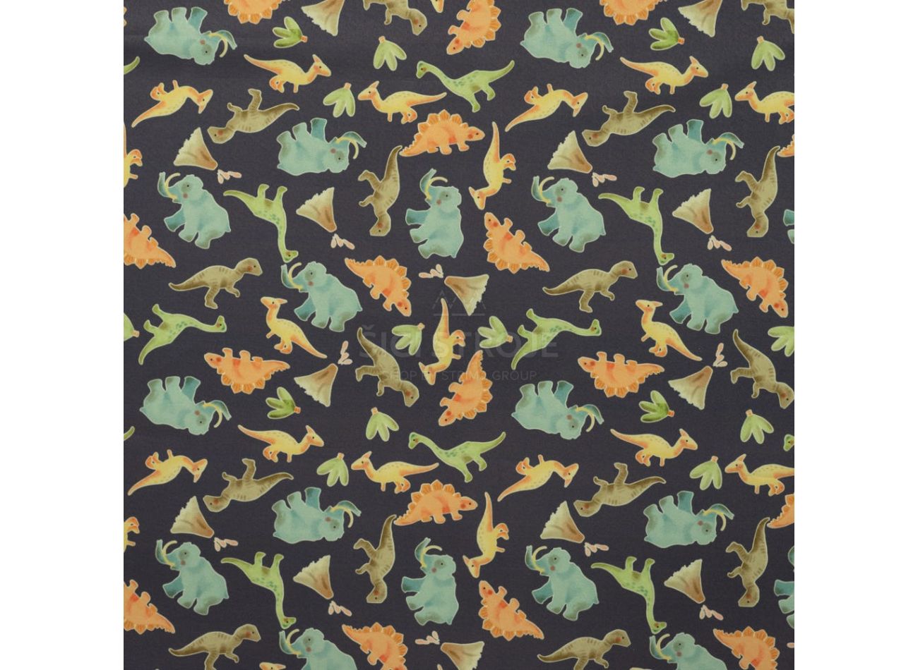 Soft Shell Print, 99% polyester, 1% elastan, minimální šíře 145 cm, gramáž 310 g/m2, vzor dinos, barva denim