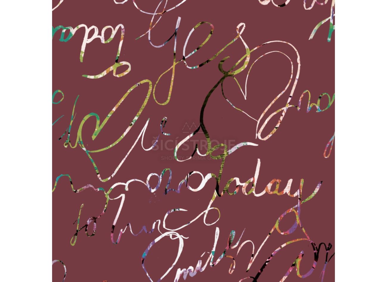 Soft Shell "Rainy" Print, 97% polyester, 3% elastan, minimální šíře 145 cm, gramáž 250 g/m2, vzor words, barva bordeaux